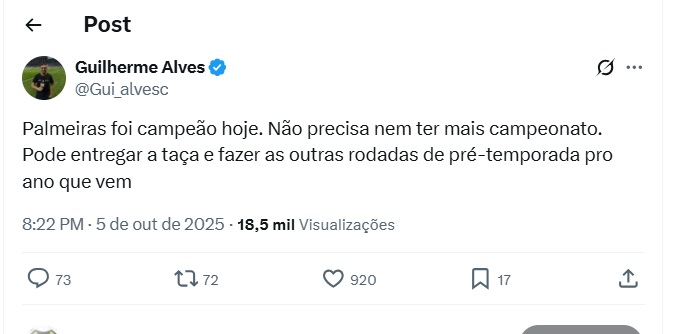 Leia mais É mais provável o Neymar ganhar a série B em 2026 do que o hexa pelo Brasil, diz estudo5 palmeirenses que tem certeza que serão campeões